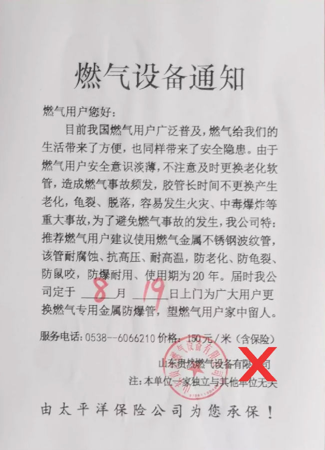 安泰燃氣公司在此鄭重聲明:在我公司所轄區(qū)域內(nèi)未開展此類業(yè)務(wù),且未委派任何單位開展此類業(yè)務(wù)。請廣大燃氣用戶仔細辨別,謹(jǐn)防上當(dāng)受騙購買不合格產(chǎn)品,影響用氣安全。